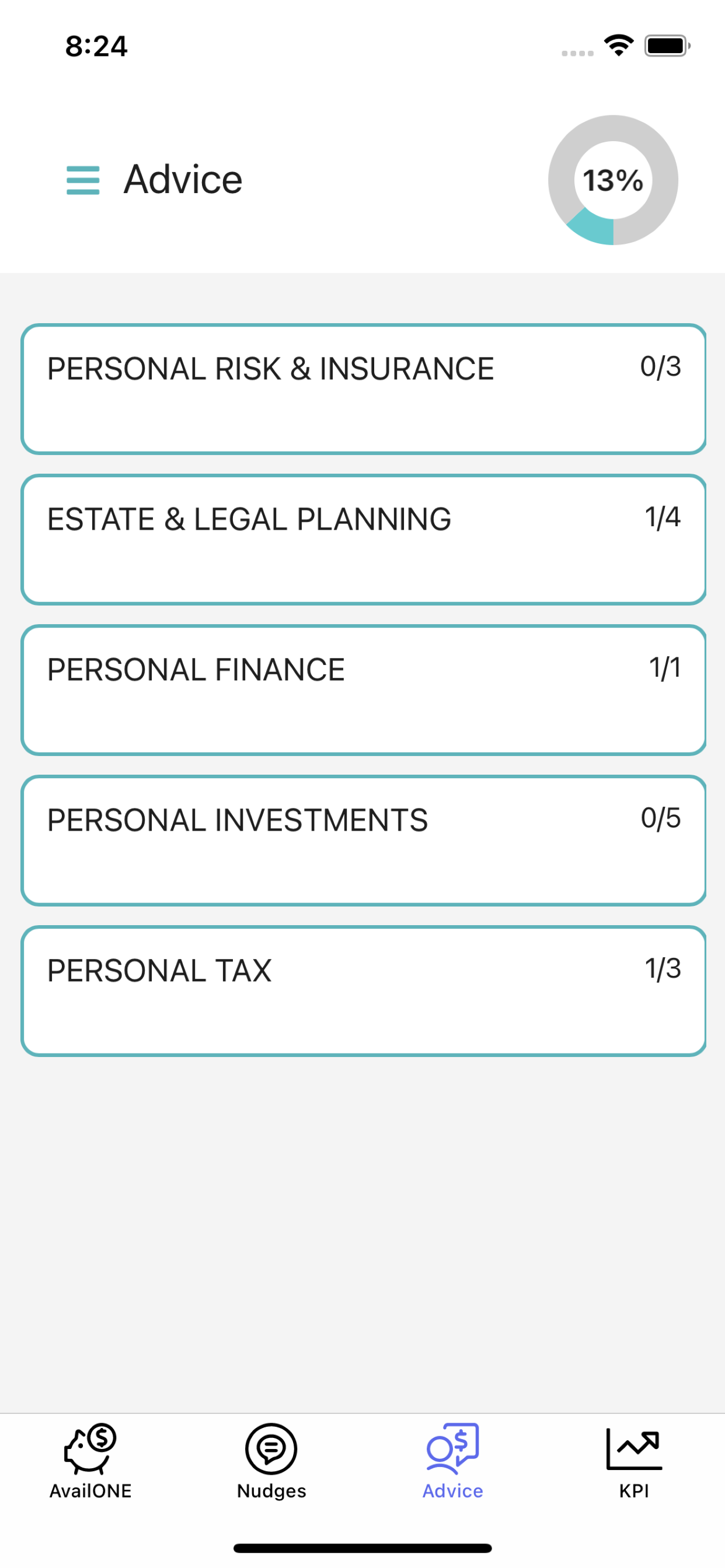 Structured advice planning across Personal Risk & Insurance, Estate & Legal Planning, Personal Finance, Investments, and Tax — with completion tracking.