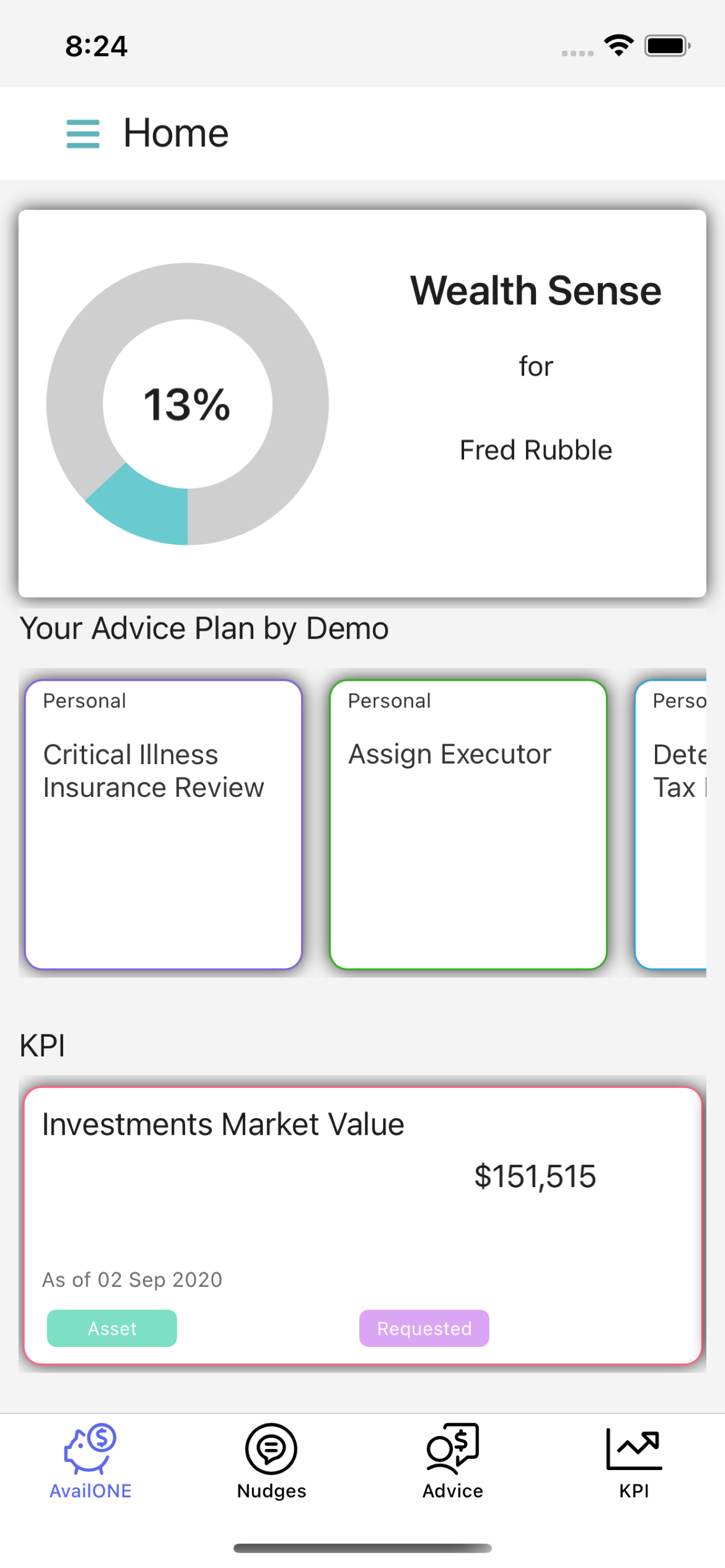 At-a-glance financial health scoring with a live Wealth Sense gauge, personalized advice plans, and real-time KPI tracking for investment portfolios.