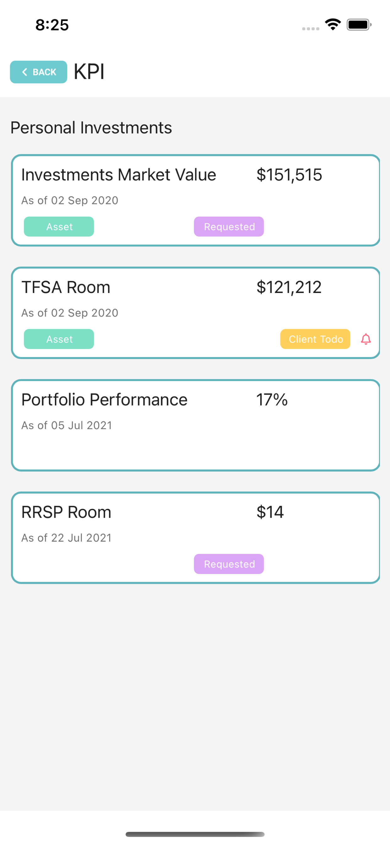 Real-time tracking of investment market values, TFSA/RRSP contribution room, and portfolio performance metrics — all in one focused view.